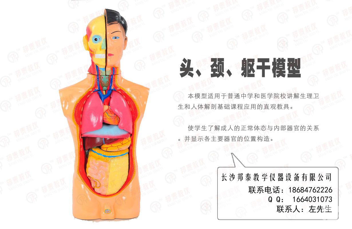 本模型主要顯示人體內(nèi)部器官的位置及頭部解剖的形態(tài)和構(gòu)造。并突出表現(xiàn)呼吸、消化、泌尿等三個系統(tǒng)。