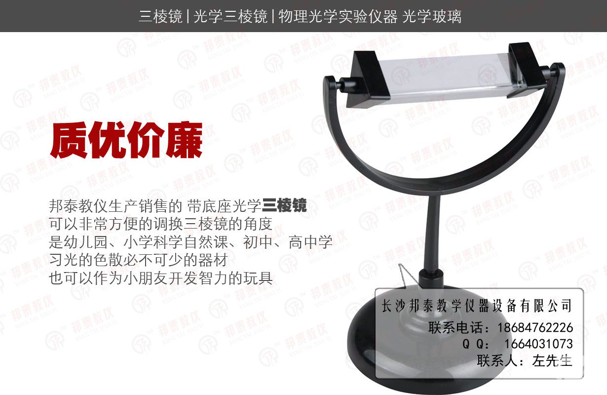 【用途】:帶底座光學三棱鏡,可以非常方便的調換三棱鏡的角度,是幼兒園、小學科學自然課、初中、高中、學習光的色散必不可少的器材,也可以作為小朋友開發智力的玩具,三棱鏡比較大,可以作為學校老師課堂演示實驗用。